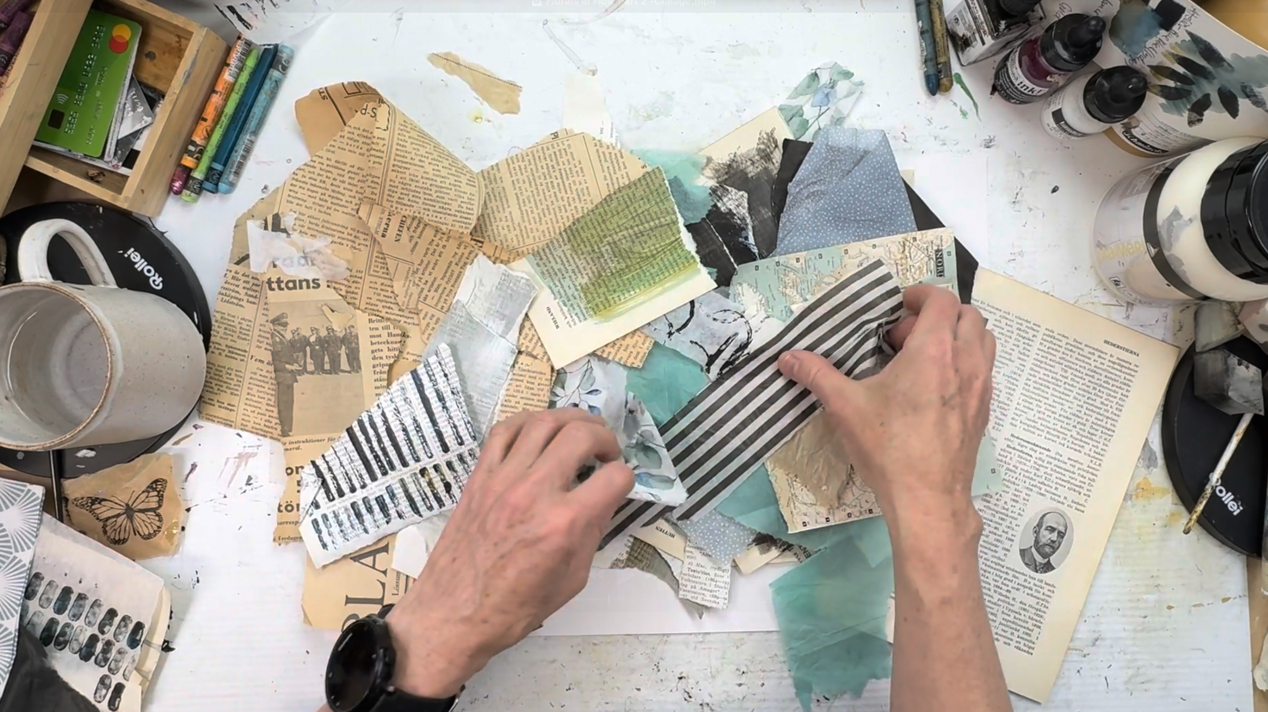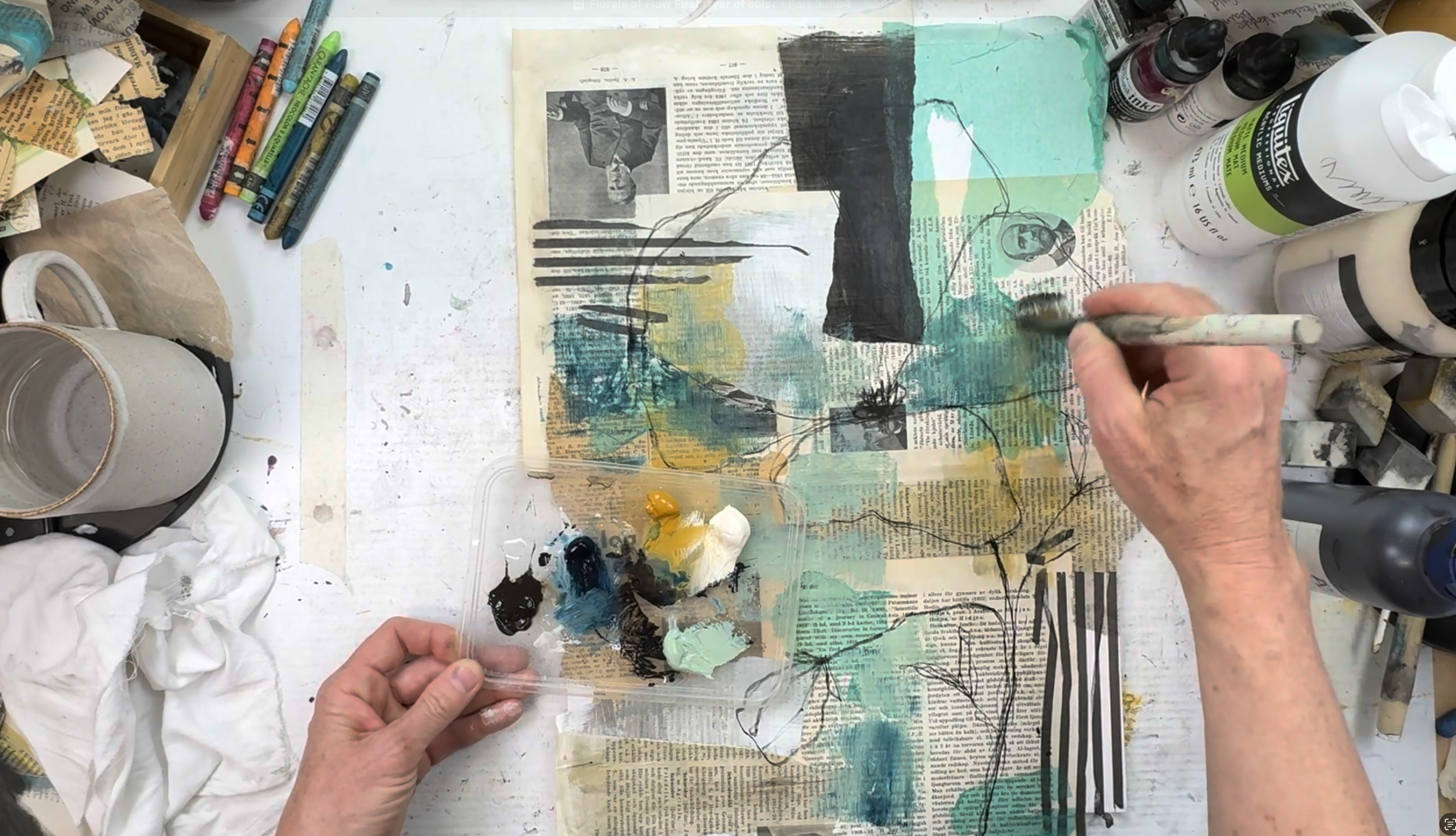 Use a mix of mixed media materials like acrylic paint, acrylic ink, collage papers, Stabilo All pencil and more