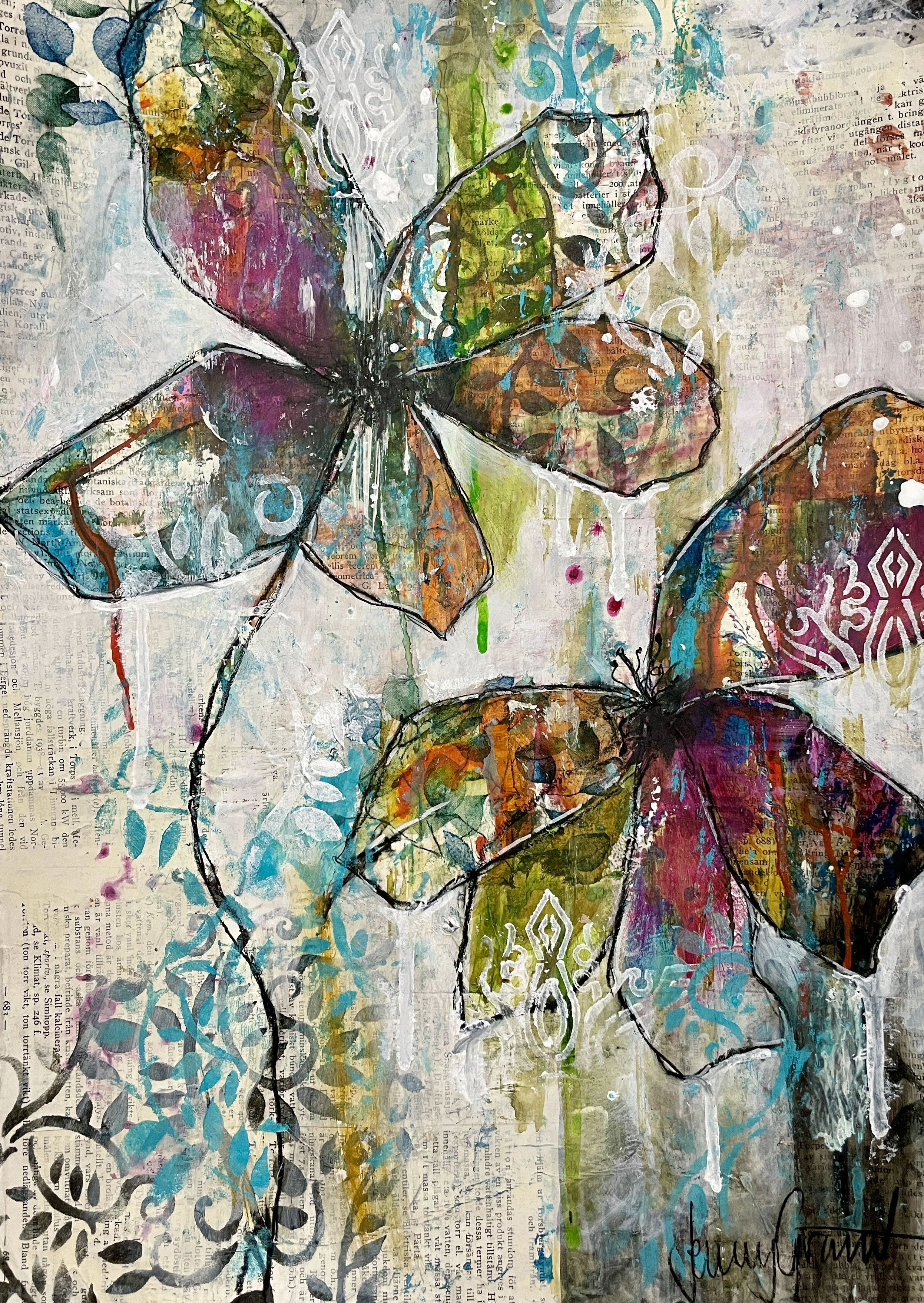 Join me live from the comfort of your home for a relaxed and inspiring mixed media painting session. We’ll use collage, acrylic paint, inks, and more to explore expressive, grungy florals using my fun mixed media process in many layers.