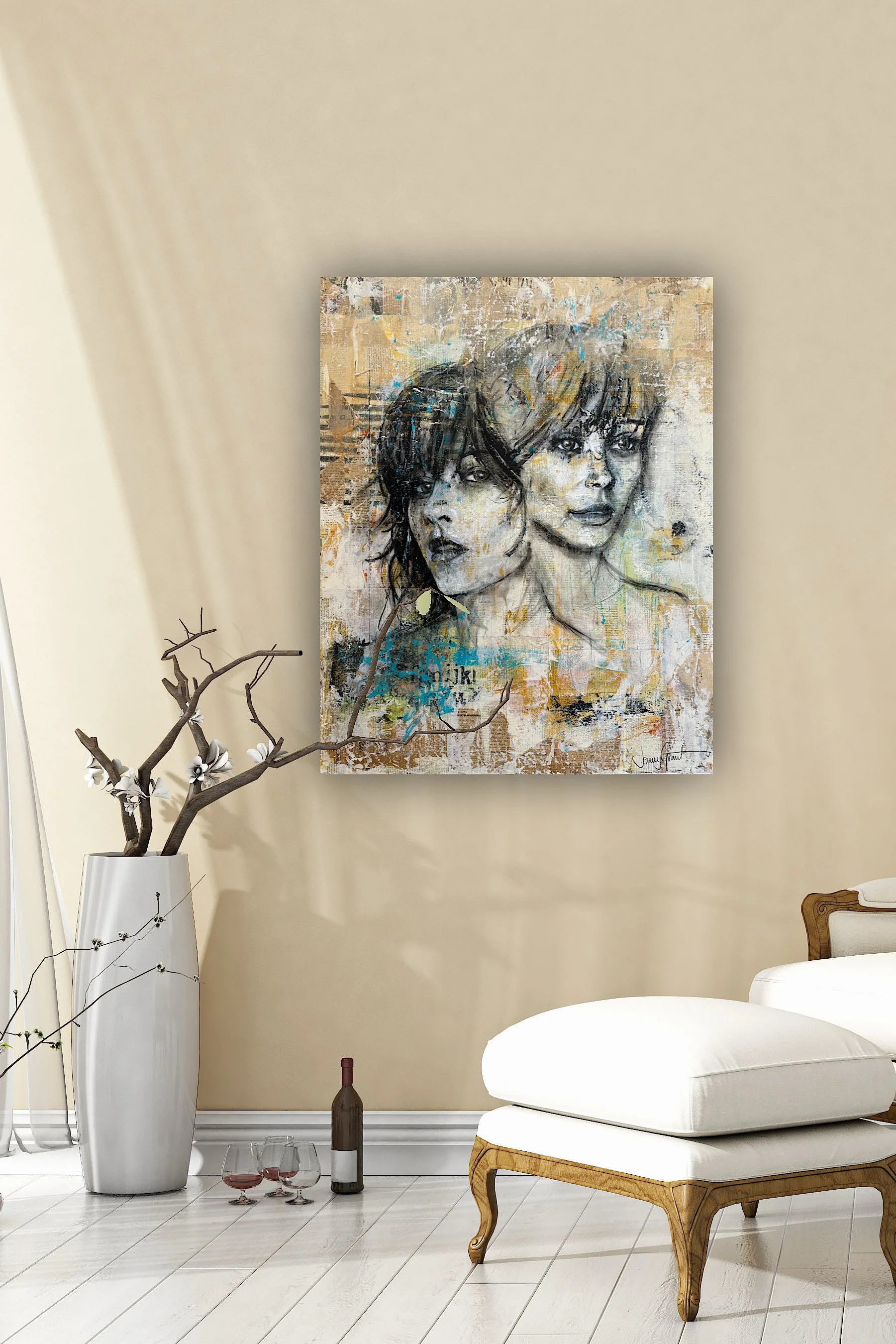 “Soul sisters we are” is about the strength of being truly seen. To walk side by side with a friend who know your stories and love you through every layer. They are painted in many layers on stretched canvas .